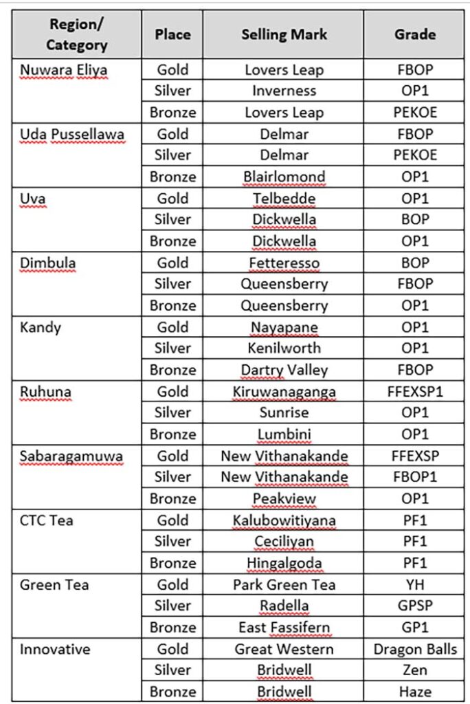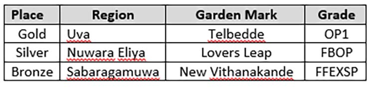 Entries for the competition were accepted only from identified tea grades from the seven recognized agro–climatic zones (Nuwara Eliya, Uda Pussellawa, Uva, Dimbula, Kandy, Sabaragamuwa and Ruhuna), green tea sector, CTC as well as innovative category. SLTB received total of 430 entries from tea estates under these 10 categories for the evaluation. After many rounds of Blind Tasting Sessions for these categories by an expert tasting panel, Gold, Silver and Bronze winners were selected for each category. In addition to that, overall Gold, Silver and Bronze winners were selected from the Gold winners of the Seven Agro-Climatic Regions. Accordingly, following Garden Marks and Tea Grades were selected by the Tasting Panel as winners:
